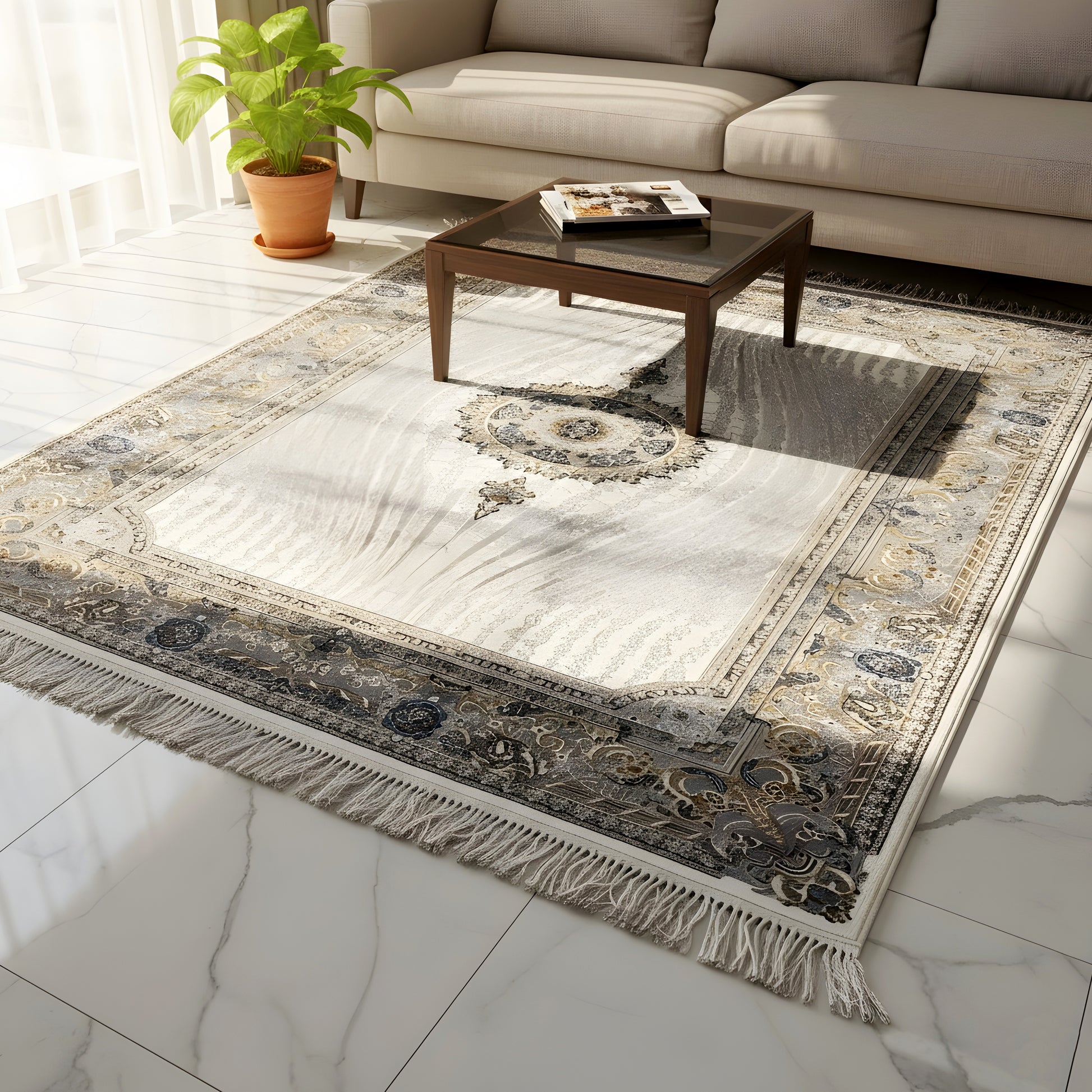 This machine-woven polypropylene rug in a classic vintage style, measuring 160x230 cm, features an elegant medallion pattern in soft gray and beige tones. The durable material is especially easy to care for and robust, ideal for high-traffic areas such as the living room or bedroom. Add a touch of timeless elegance to your home and create a cozy atmosphere with this stylish floor decoration – perfect for modern and classic decor.