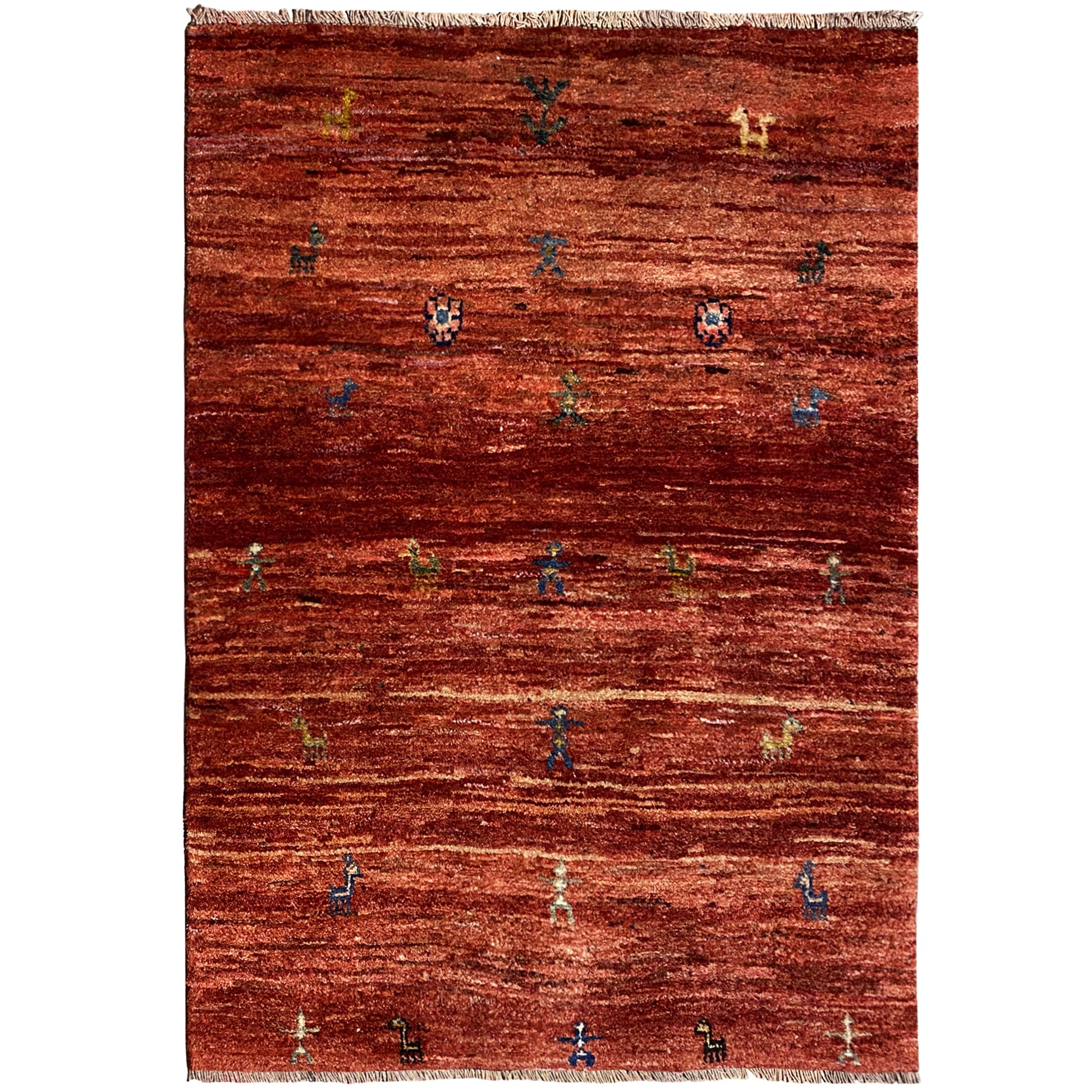 Questo espressivo tappeto Gabbeh annodato a mano, di dimensioni 140x93cm, è realizzato in lana filata a mano e tinta con coloranti vegetali. Il suo campo rosso scuro è animato da una varietà di piccoli motivi giocosi di animali e figure con accenti colorati, che raccontano una storia tradizionale. Questo tappeto unico dona a ogni ambiente, sia in stile rustico, tribale o eclettico, un'atmosfera calda e autentica ed è una vera opera d'arte per il pavimento.