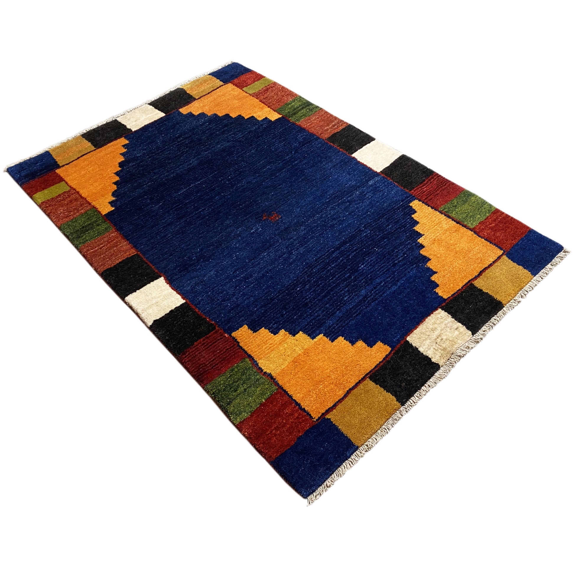 Dieser handgeknüpfte Gabbeh Teppich in 164x114cm Größe, gefertigt aus handgesponnener, pflanzengefärbter Wolle, bringt einen natürlichen, rustikalen Akzent in Ihr Zuhause. Das minimalistische Design mit zentralem Rautenmuster und lebendigen Farben macht ihn zu einem vielseitigen Element für moderne und traditionelle Einrichtungsstile, das Wärme und Charakter verleiht.