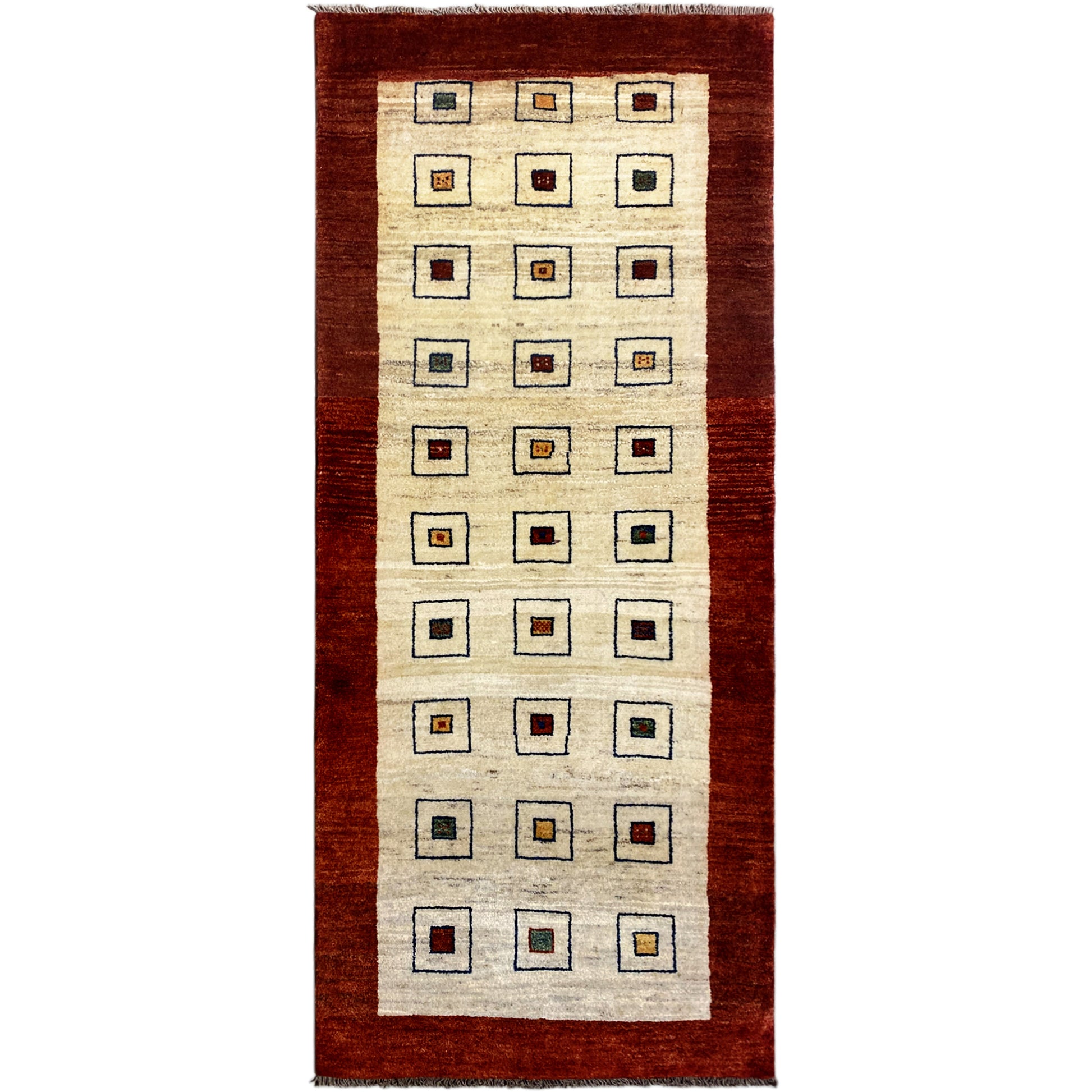 Dieser einzigartige, handgeknüpfte Gabbeh Läufer in der Größe 195x84cm ist aus handgesponnener, pflanzengefärbter Wolle gefertigt. Sein Design präsentiert ein Feld in Naturbeige mit einem Gitter aus einzelnen, stilisierten Quadraten, die kleine, traditionelle Motive enthalten, umrahmt von einer rostroten Bordüre. Perfekt für Flure und schmale Räume, verleiht dieser Läufer Ihrem Zuhause einen Hauch von rustikalem, tribalistischem Charme und sorgt für natürliche Wärme und Gemütlichkeit.