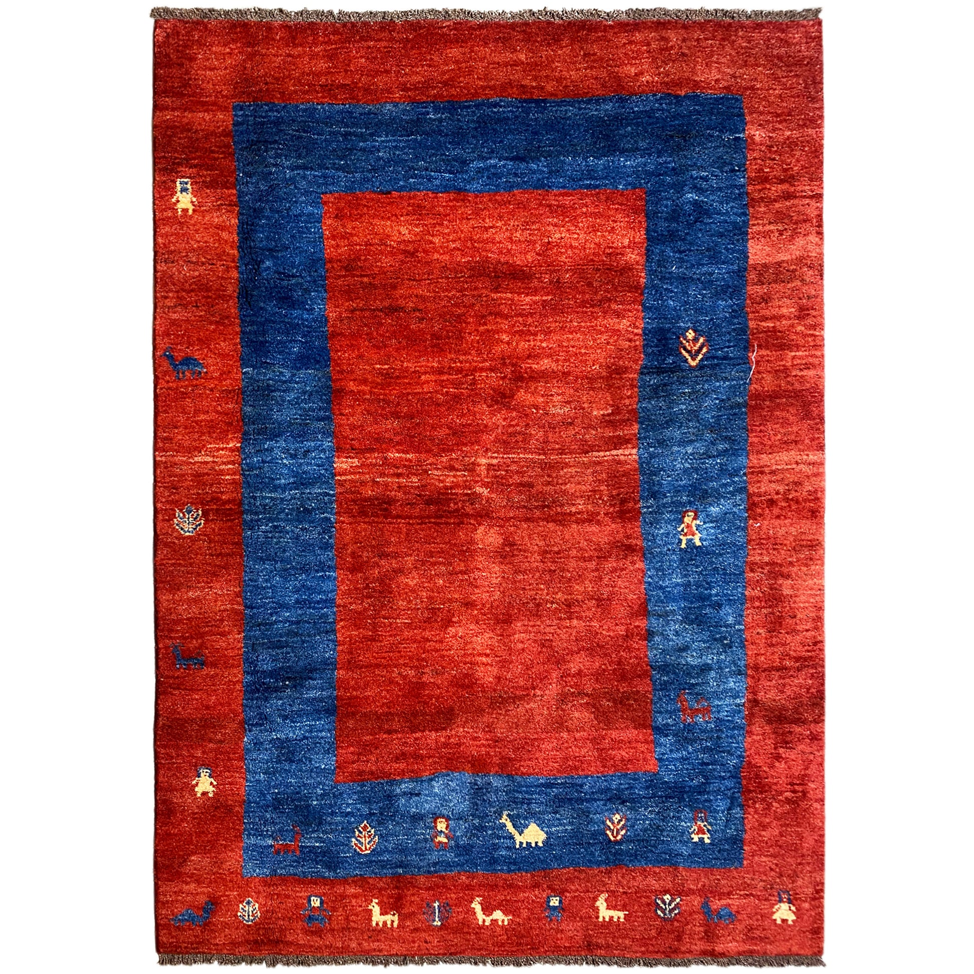 Dieser eindrucksvolle, handgeknüpfte Gabbeh Teppich aus handgesponnener, pflanzengefärbter Wolle präsentiert sich mit einem kräftigen roten Grundton, der von einem markanten blauen Rechteck im Zentrum und einem detailreichen blauen Rand mit stilisierten Figuren umgeben ist. Mit seinen großzügigen Maßen von 270x198 cm ist dieser Teppich ein zentraler Blickfang, der jedem Wohnbereich eine dynamische und zugleich erdverbundene Atmosphäre verleiht. Die Kombination aus leuchtenden Farben, dem geometrischen Muster und den charmanten figurativen Elementen macht diesen Teppich zu einem einzigartigen Kunstwerk, das sowohl traditionelle als auch moderne Einrichtungsstile bereichert.