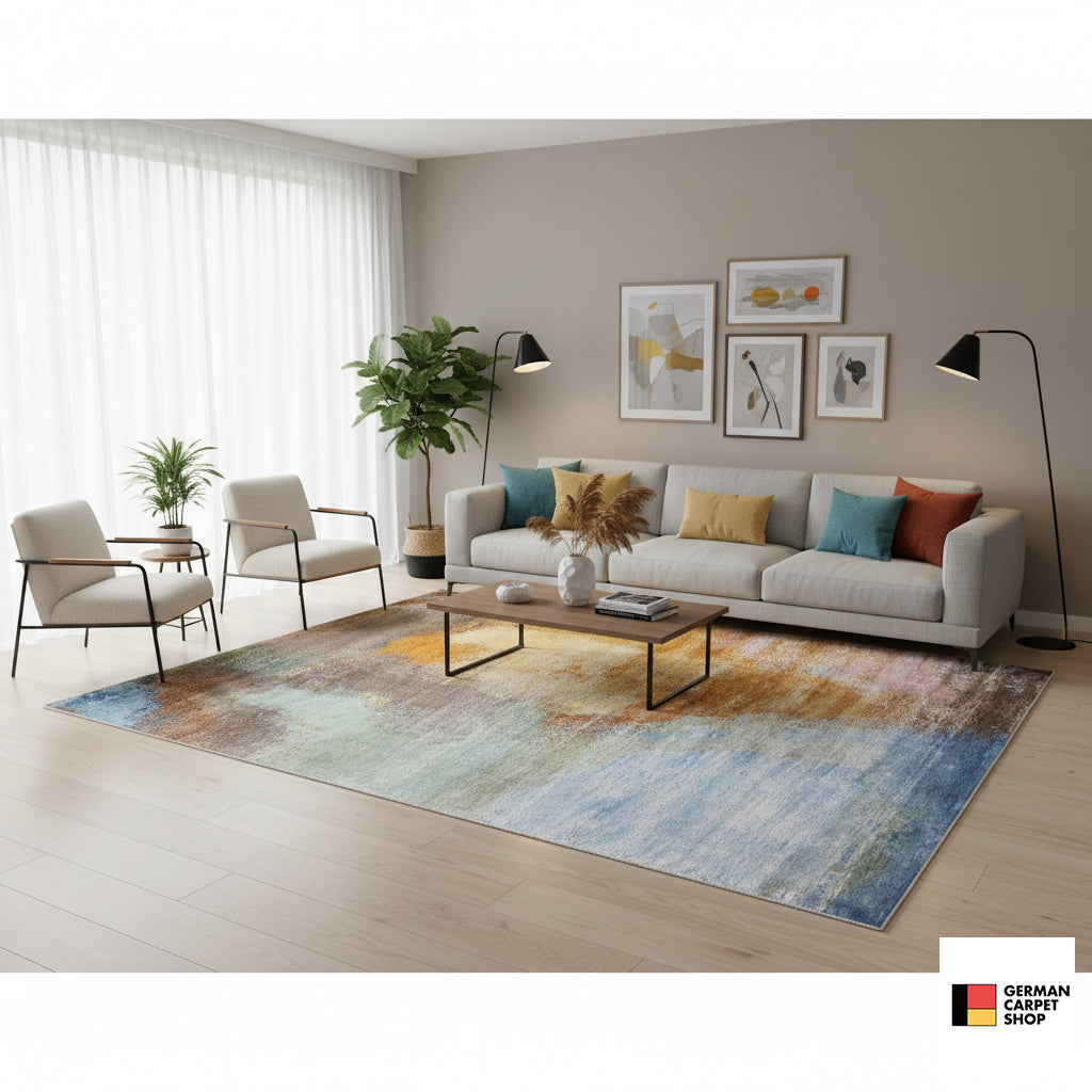 Dieser handgeknüpfte moderne Teppich aus einer hochwertigen Mischung aus handversponnener Wolle und Viskose ist ein wahres Kunstwerk. Der Teppich besticht durch sein abstraktes Muster und die lebendige Farbpalette in Blau-, Gold-, Rosé- und Brauntönen, die wie ein expressionistisches Gemälde wirken. Mit seiner großzügigen Größe von 312x209 cm ist er der perfekte Blickfang für große Wohn- oder Essbereiche. Die Viskose-Anteile sorgen für einen sanften Glanz, der die Farben noch intensiver erscheinen lässt und jedem Raum eine einzigartige Note verleiht.