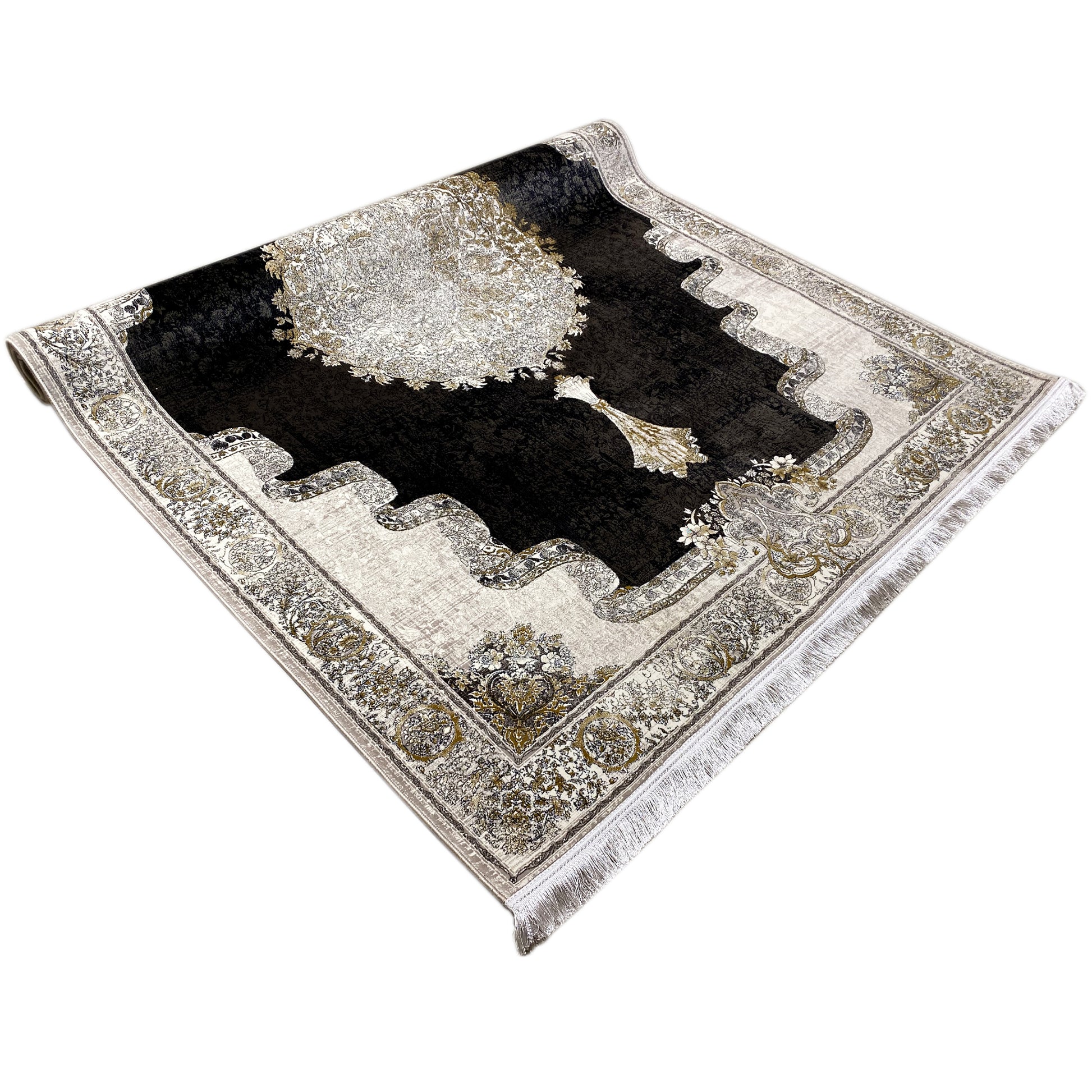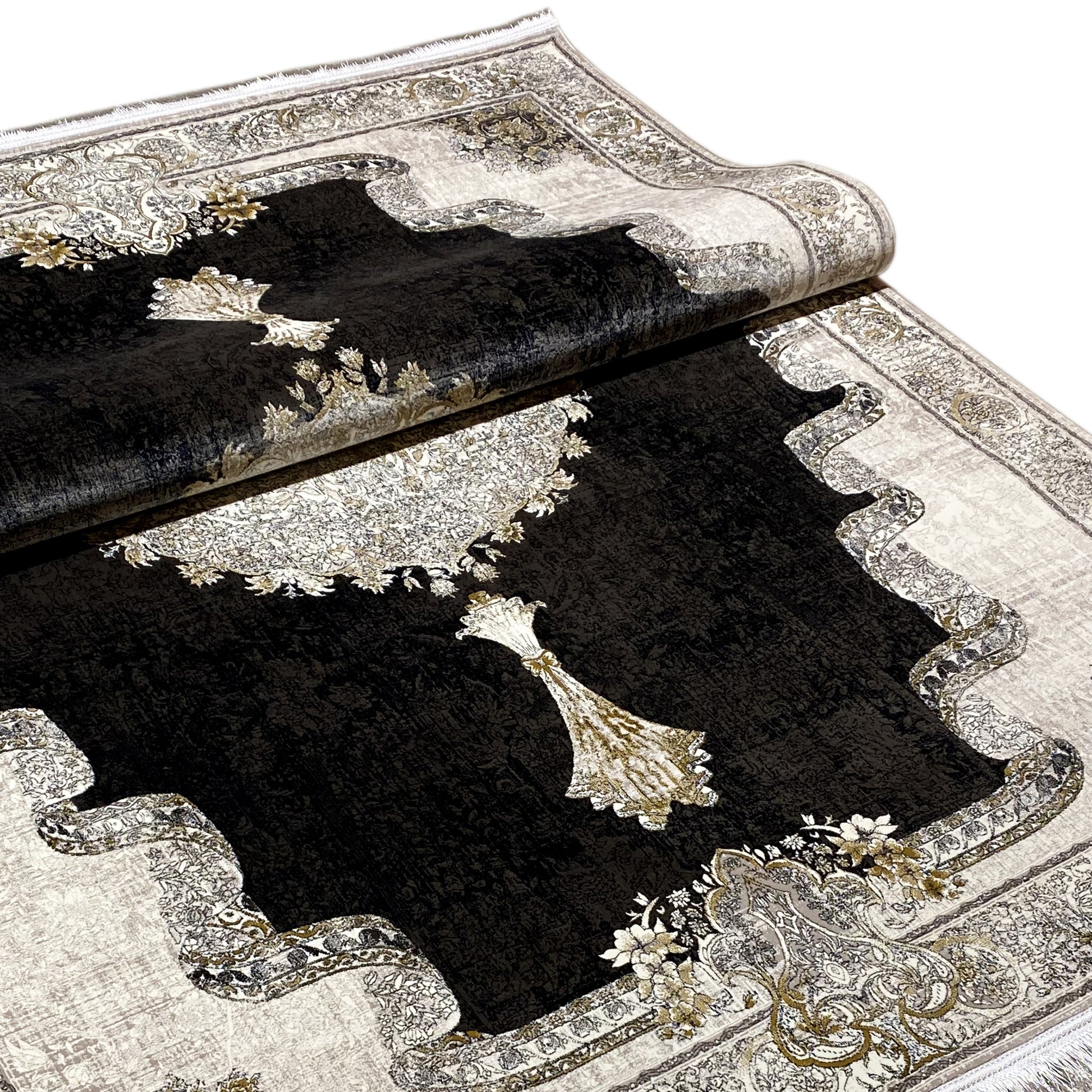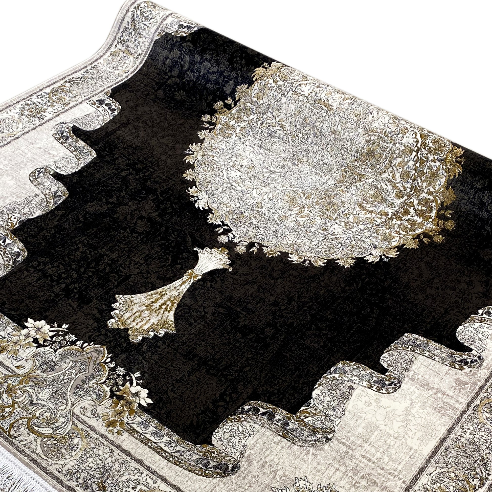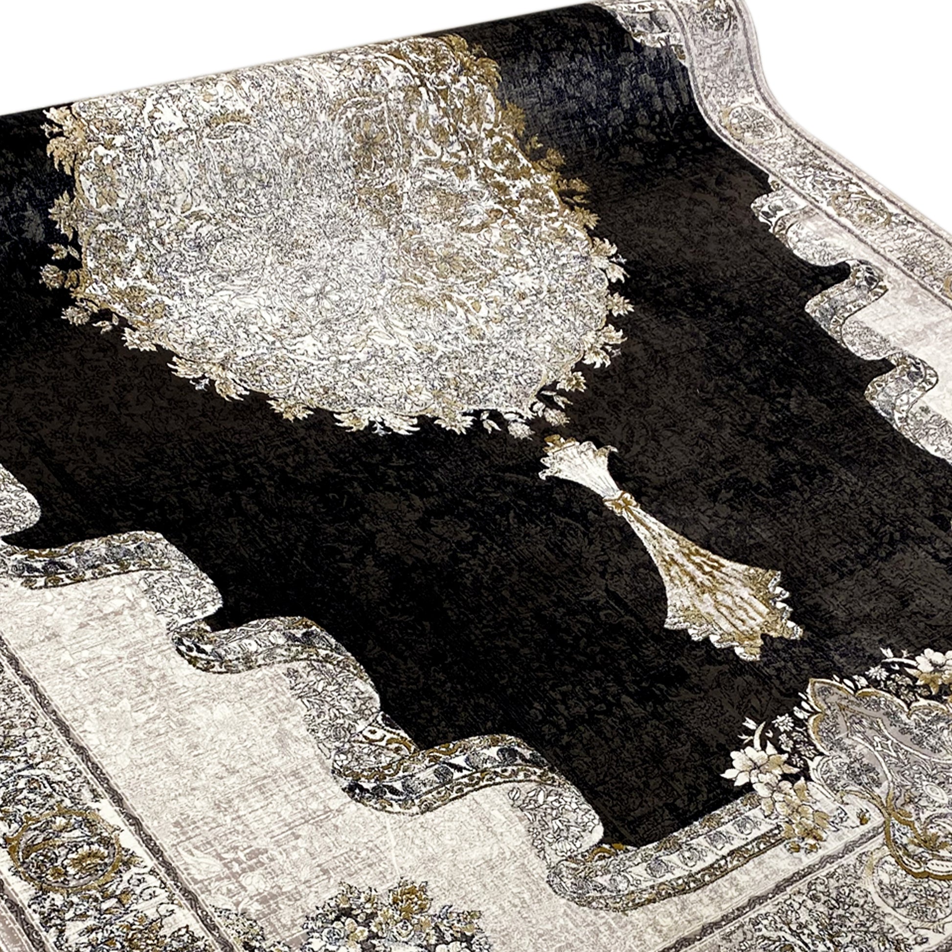 Verleihen Sie Ihrem Zuhause mit diesem wunderschönen klassischen Teppich einen Hauch von dramatischer Eleganz. Sein auffälliges, dunkles Innenfeld in Rauchgrau bildet einen eindrucksvollen Kontrast zur hellen, cremefarbenen Bordüre und dem detailreichen Medaillon in der Mitte. Das einzigartige Umrandungsmuster schafft einen zusätzlichen luxuriösen Akzent. Gefertigt aus 100% hitzebehandeltem Acryl, ist dieser weiche und strapazierfähige Teppich perfekt für stark frequentierte Bereiche, da er luxuriösen Stil mit moderner Widerstandsfähigkeit verbindet. Die großzügige Größe von 170x240cm ist ideal, um Ihrem Wohn- oder Schlafzimmer einen eleganten Blickfang zu verleihen.