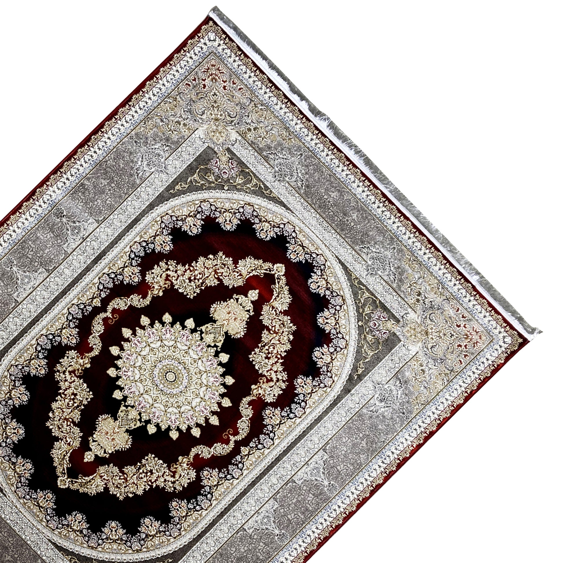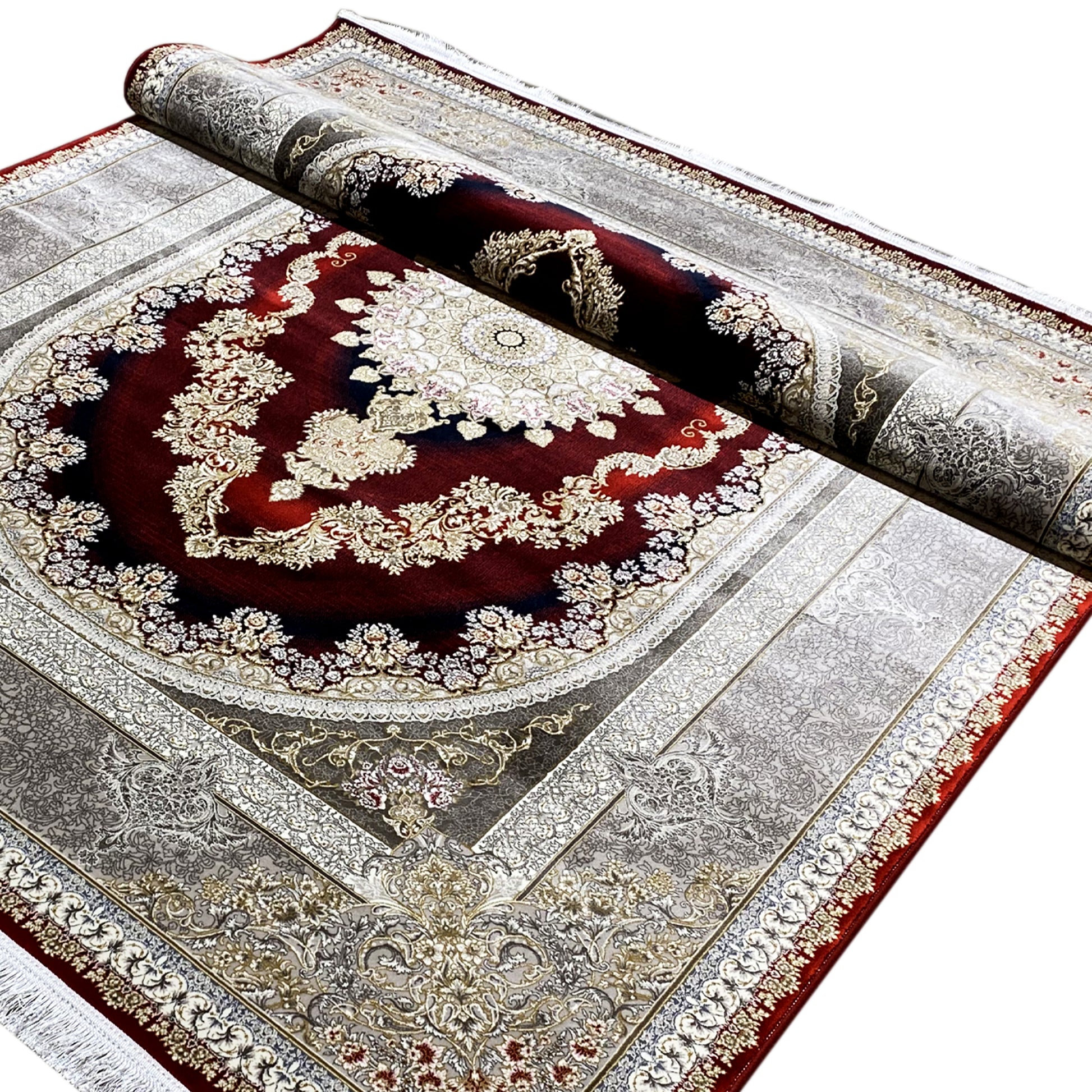 Verleihen Sie Ihrem Zuhause opulente Eleganz mit diesem wunderschönen klassischen Teppich. Sein markantes ovales Medaillon-Design zeigt eine kunstvolle Musterung in tiefen Rot- und Goldtönen, die von einer raffinierten silbernen Bordüre umrahmt wird. Gefertigt aus 100% hitzebehandeltem Acryl, ist dieser weiche und strapazierfähige Teppich ideal für stark frequentierte Bereiche und verbindet luxuriösen Stil mit moderner Widerstandsfähigkeit. Die großzügige Größe von 170x240cm macht ihn zum perfekten Statement-Stück für Ihr Wohn- oder Esszimmer.