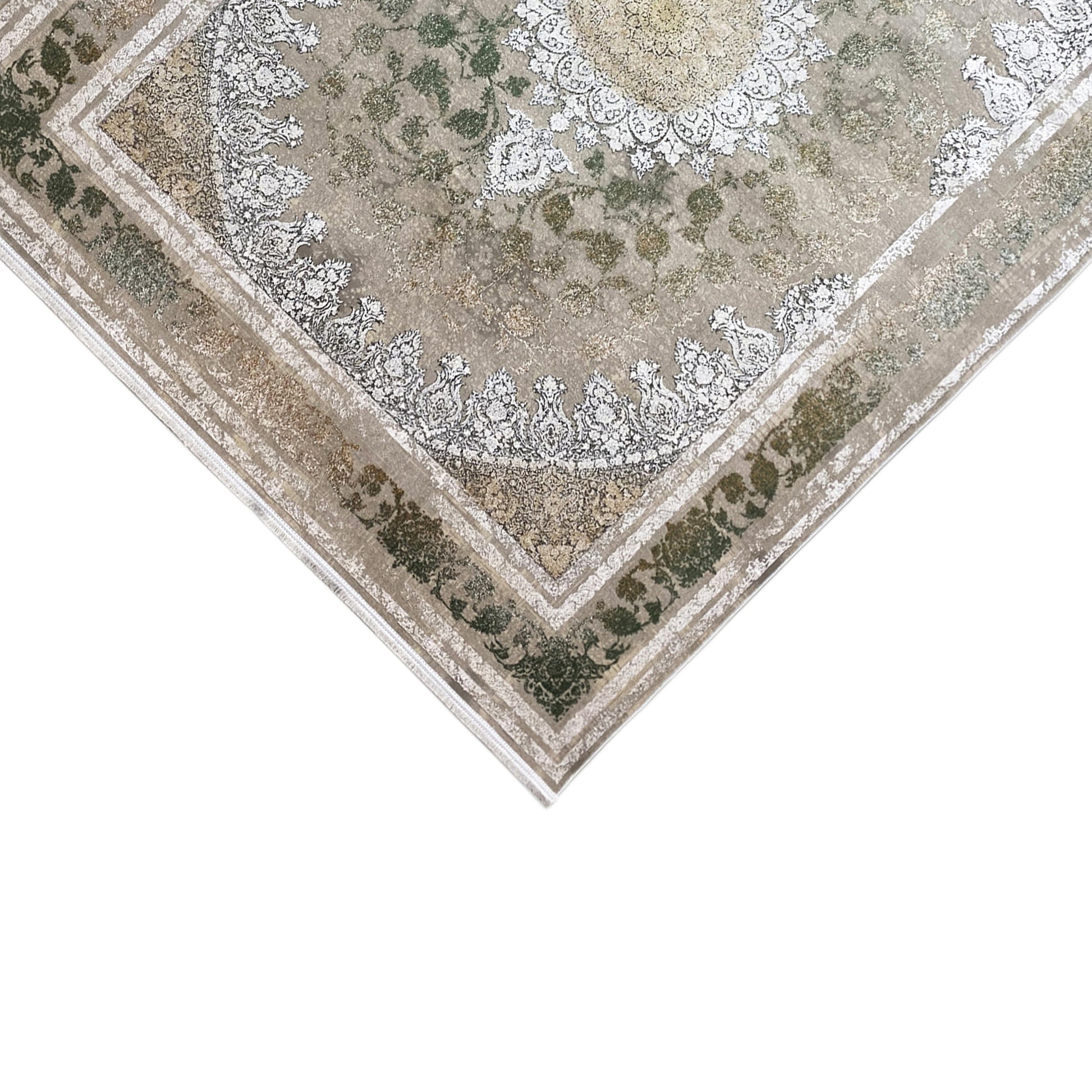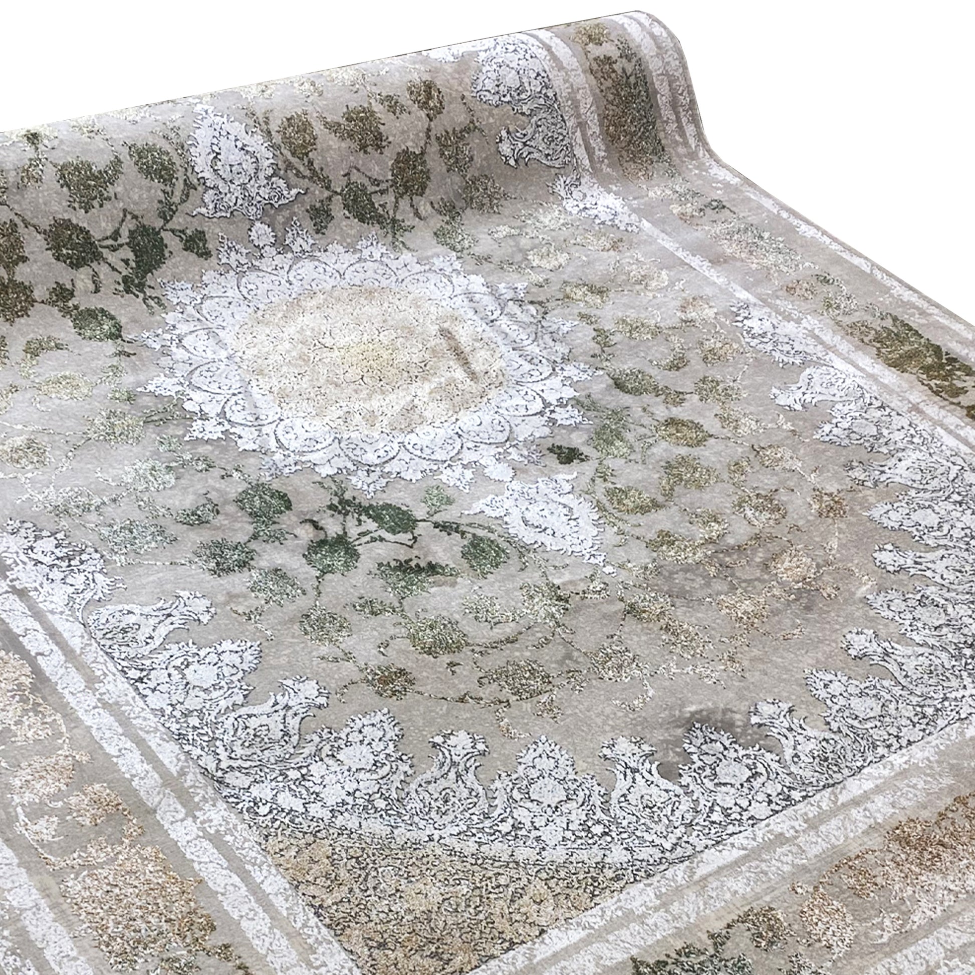 Verleihen Sie Ihrem Zuhause eine luxuriöse, zeitlose Atmosphäre mit diesem wunderschönen klassischen Teppich. Das markante zentrale Medaillon und das detailreiche Muster in schimmernden Silber- und Grüntönen heben sich elegant von einem rauchigen, dezent verblichenen Hintergrund ab. Gefertigt aus 100% hitzebehandeltem Acryl, ist dieser weiche und strapazierfähige Teppich perfekt für stark frequentierte Bereiche. Die großzügige Größe von 170x240cm ist ideal, um Ihrem Wohn- oder Esszimmer einen stilvollen Akzent zu verleihen.