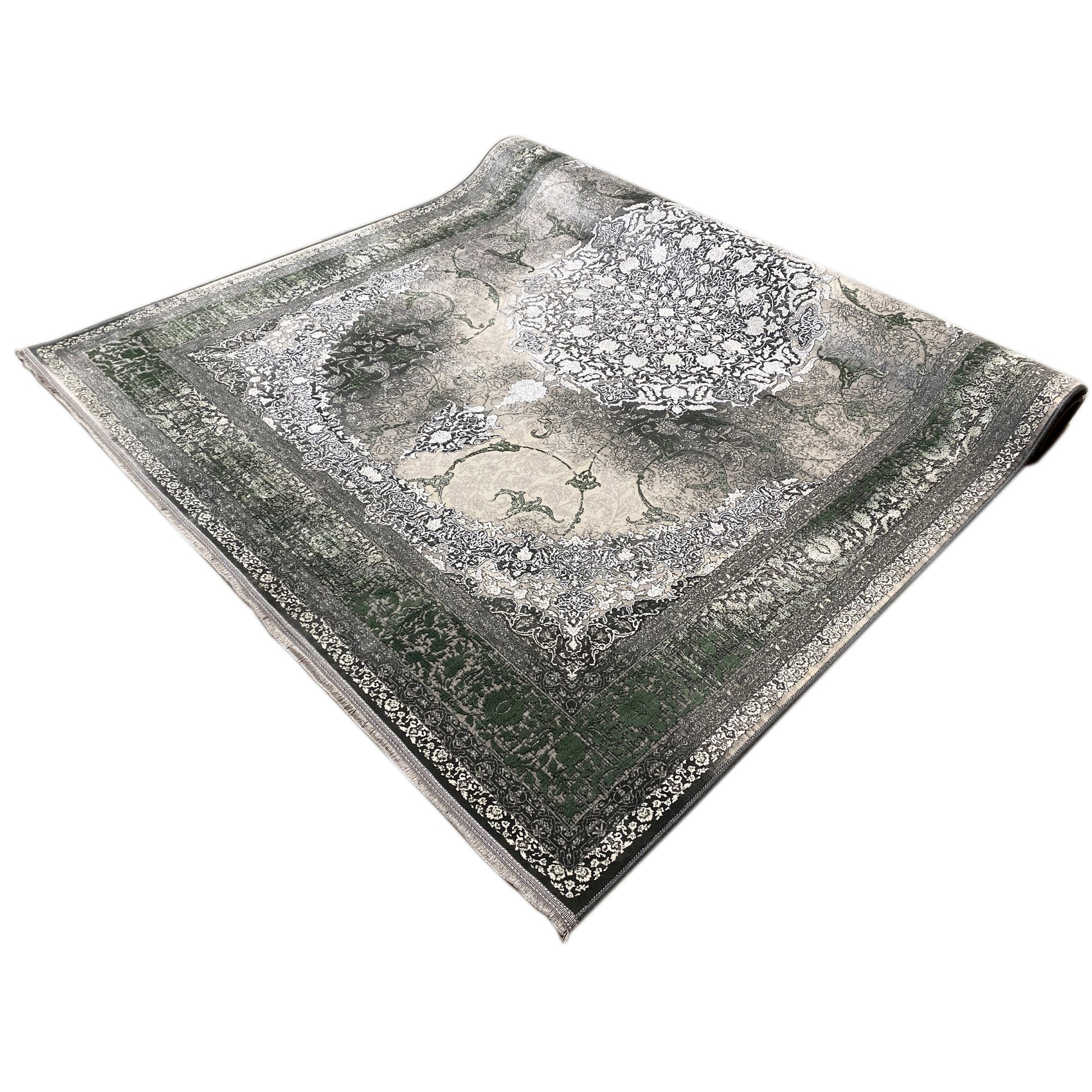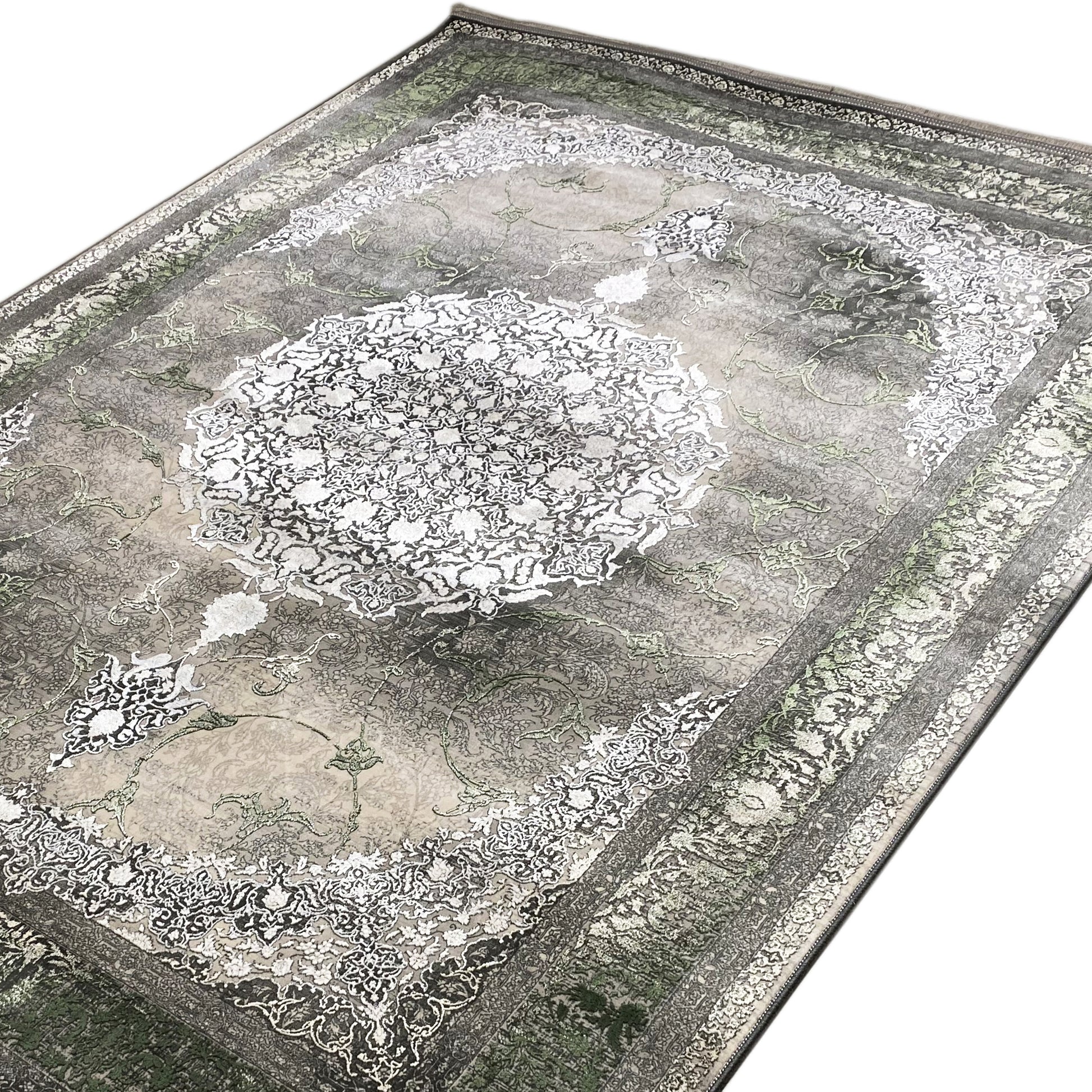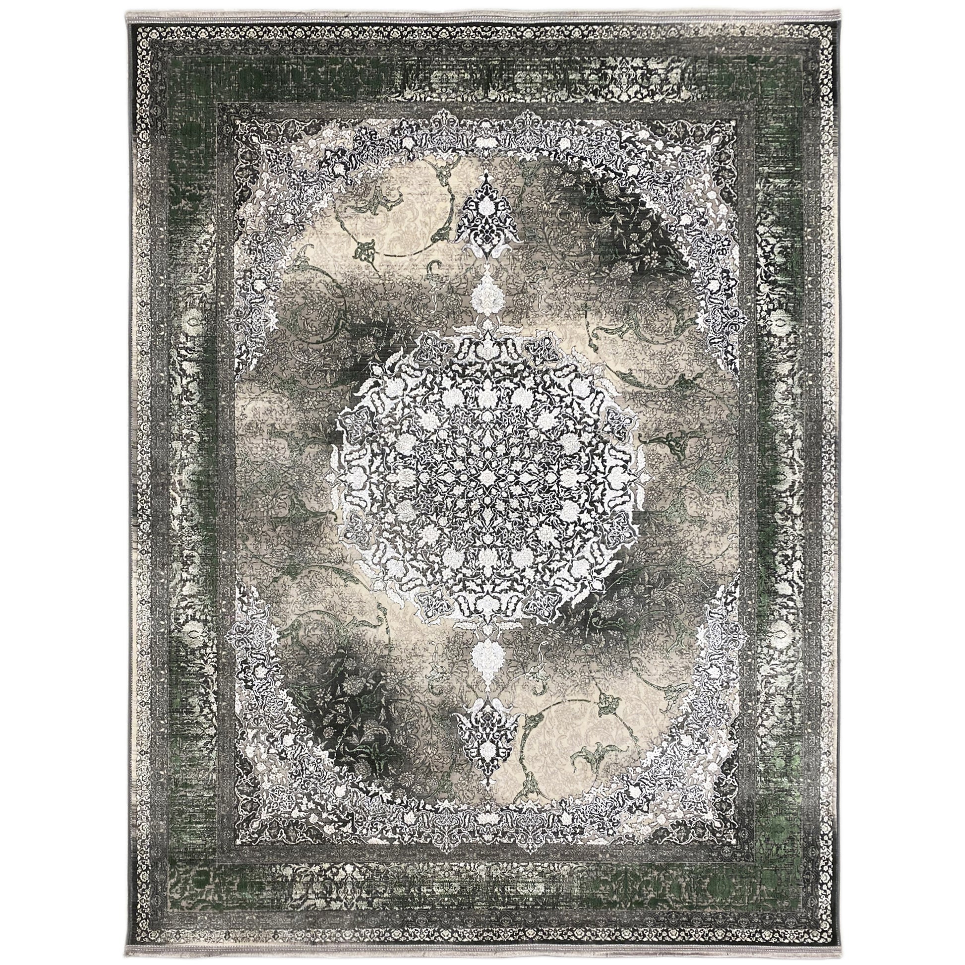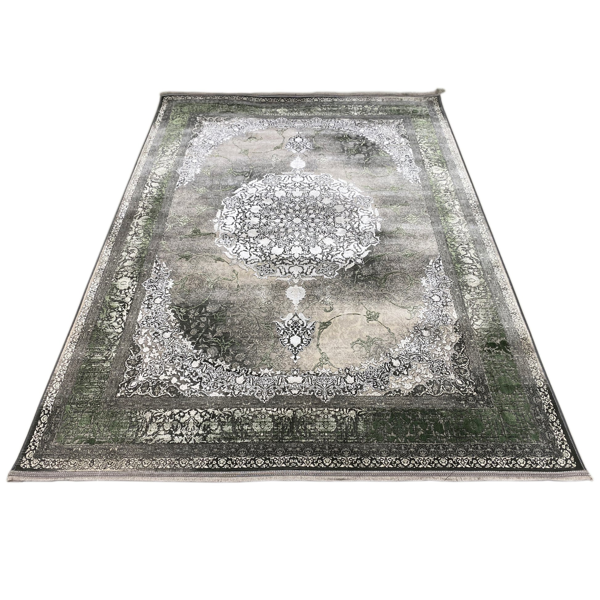 Verleihen Sie Ihrem Zuhause mit diesem wunderschönen klassischen Teppich einen Hauch von luxuriöser Eleganz. Das kunstvolle zentrale Medaillon in Hellgrau und Cremetönen hebt sich von einem rauchigen, dezent verblichenen Hintergrund ab, der von einer satten grünen Bordüre eingerahmt wird. Gefertigt aus 100% hitzebehandeltem Acryl, ist dieser weiche und strapazierfähige Teppich perfekt für stark frequentierte Bereiche, da er luxuriösen Stil mit moderner Widerstandsfähigkeit verbindet. Die großzügige Größe von 170x240cm ist ideal, um Ihrem Wohn- oder Schlafzimmer einen eleganten Blickfang zu verleihen.