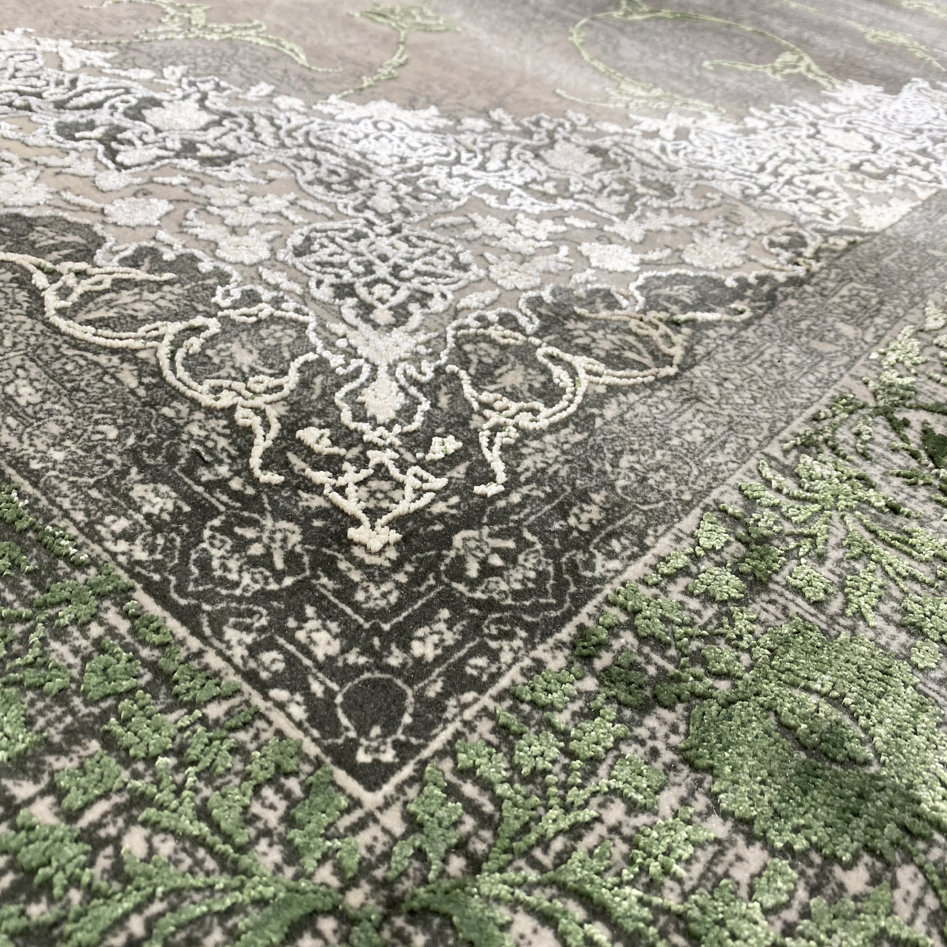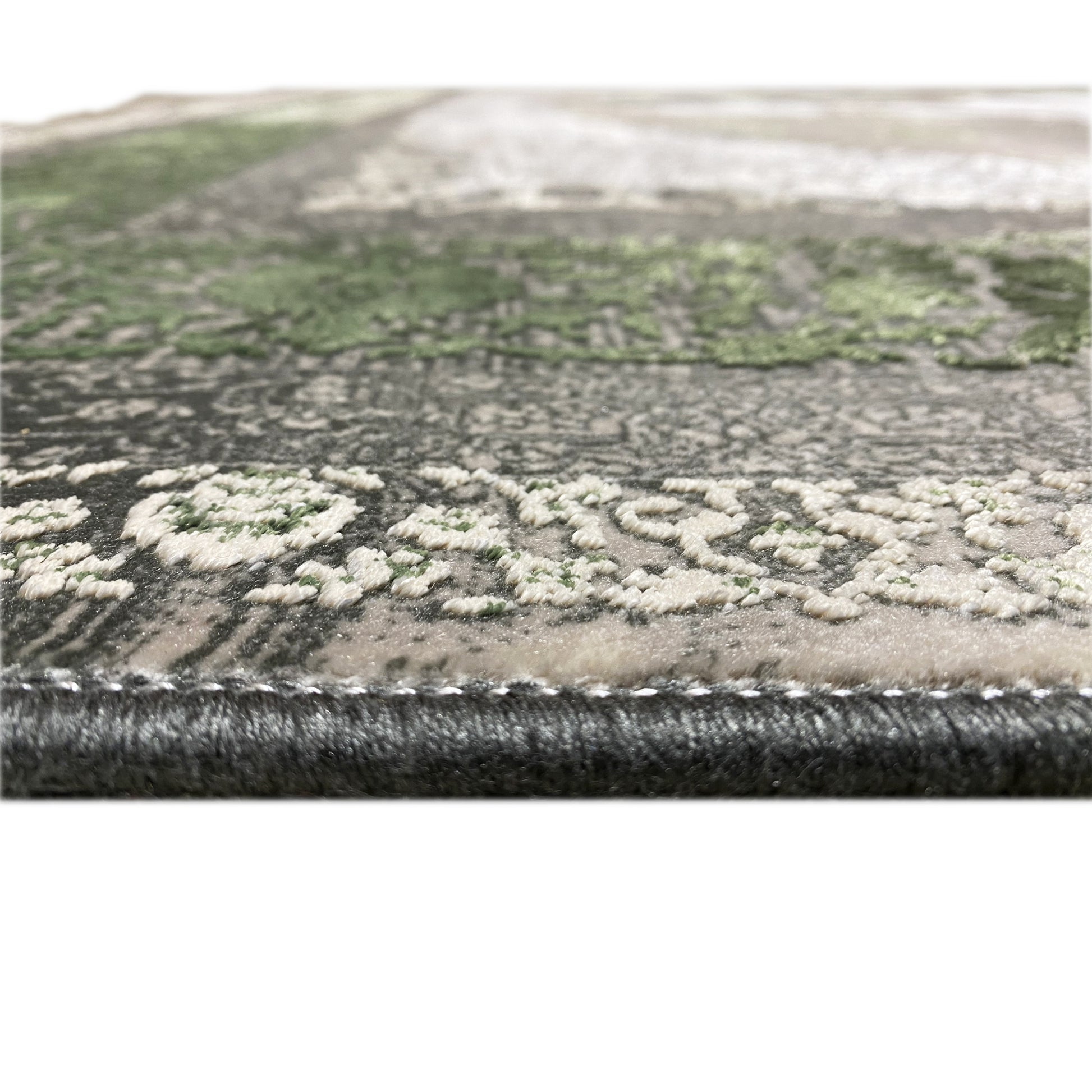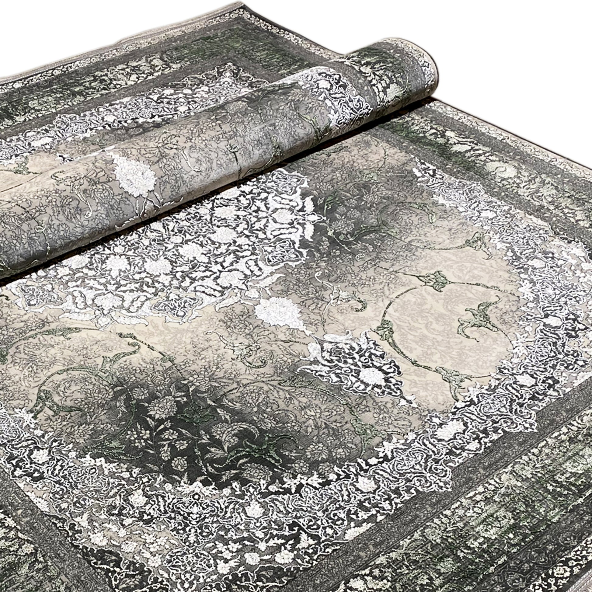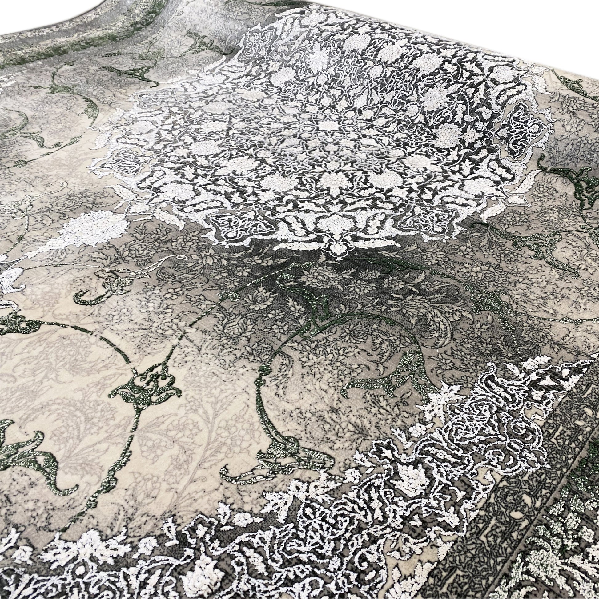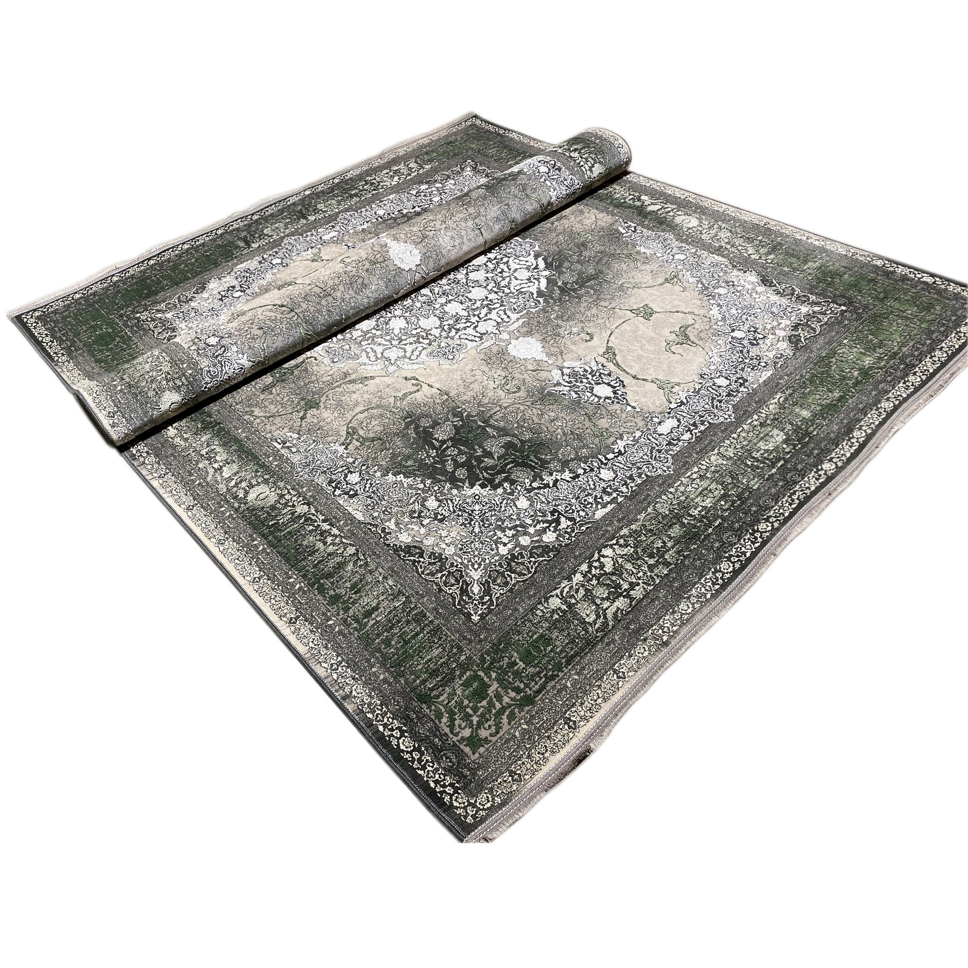Verleihen Sie Ihrem Zuhause mit diesem wunderschönen klassischen Teppich einen Hauch von luxuriöser Eleganz. Das kunstvolle zentrale Medaillon in Hellgrau und Cremetönen hebt sich von einem rauchigen, dezent verblichenen Hintergrund ab, der von einer satten grünen Bordüre eingerahmt wird. Gefertigt aus 100% hitzebehandeltem Acryl, ist dieser weiche und strapazierfähige Teppich perfekt für stark frequentierte Bereiche, da er luxuriösen Stil mit moderner Widerstandsfähigkeit verbindet. Die großzügige Größe von 170x240cm ist ideal, um Ihrem Wohn- oder Schlafzimmer einen eleganten Blickfang zu verleihen.